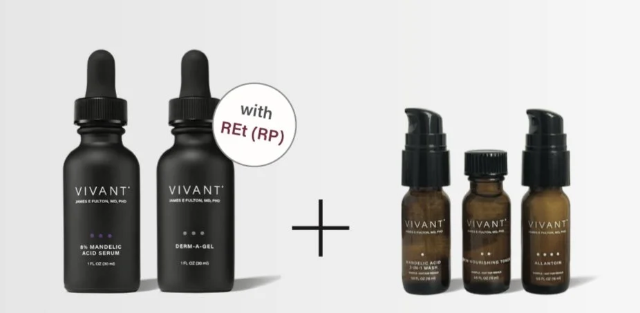 Clear & Bright Synergy Duo contains 1 full size 8% Mandelic Acid Serum, and 1 full size Derm-A-Gel for 10% off + complimentary Regimen Completer Kit (mini Mandelic Acid 3-in-1 Wash, Skin Nourishing Toner, and Allantoin: enough for 1 week trial).